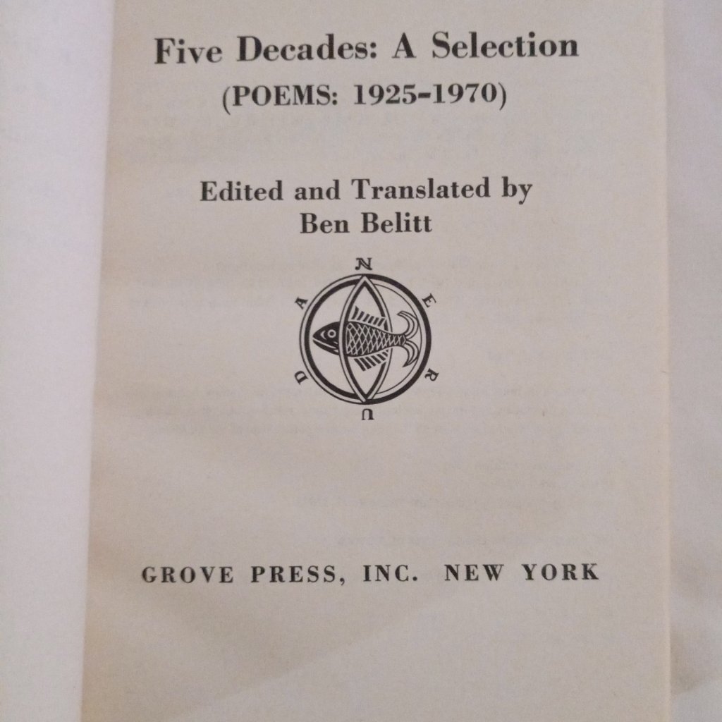 Ben Belitt has drawn the 138 selections in Five Decades from all of Neruda's major works, including the early volumes - Residence on Earth, General Song, Elemental Odes, Voyages and Homecomings, Book of Vagaries, A Hundred Love Sonnets, Black Island Memorial, The Hands of Day, World's End, and Skystones.
