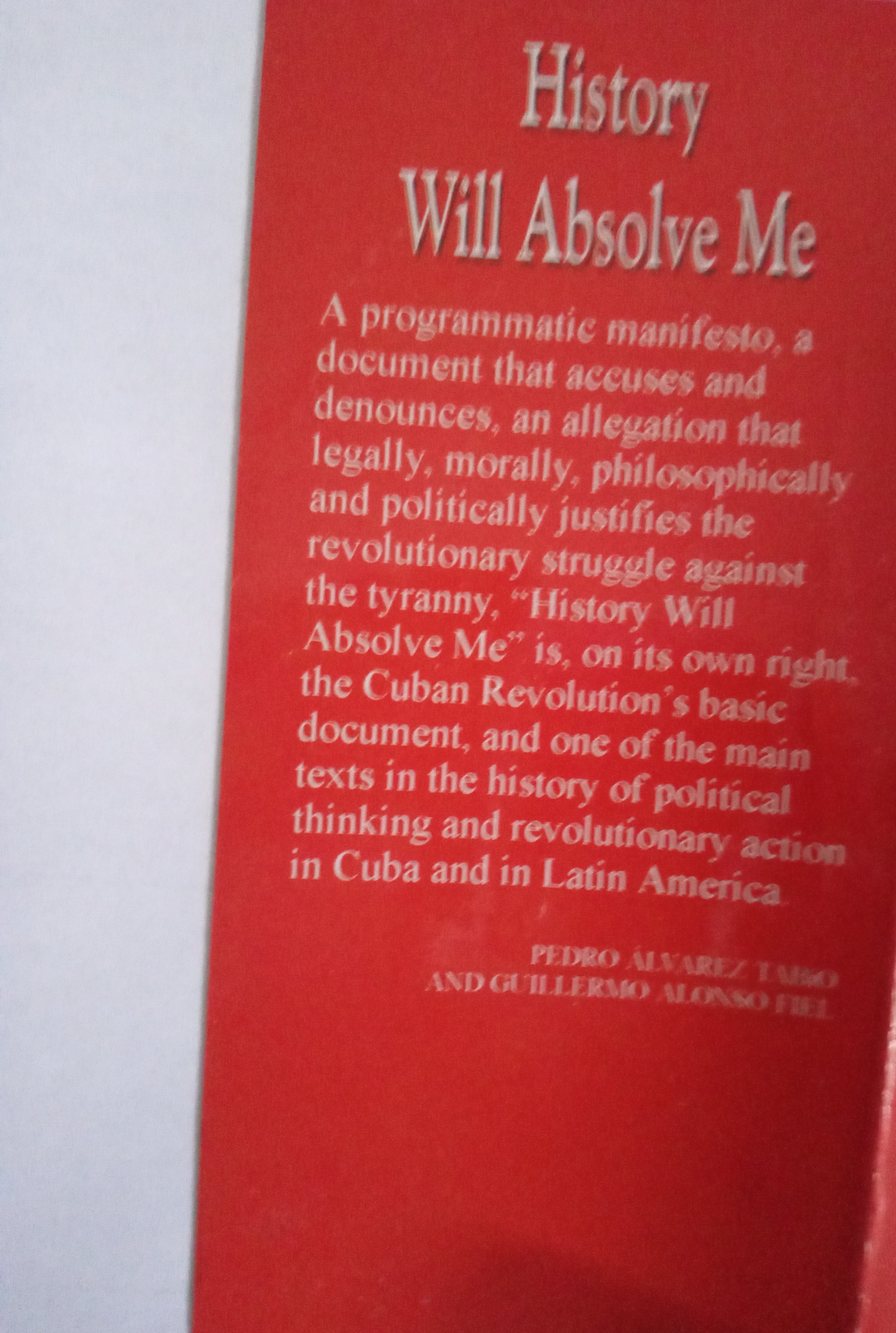 "History Will Absolve Me" is, on its own right, the Cuban Revolution's basic document and one of the main texts in the history of political thinking and revolutionary action in Cuba and in Latin America